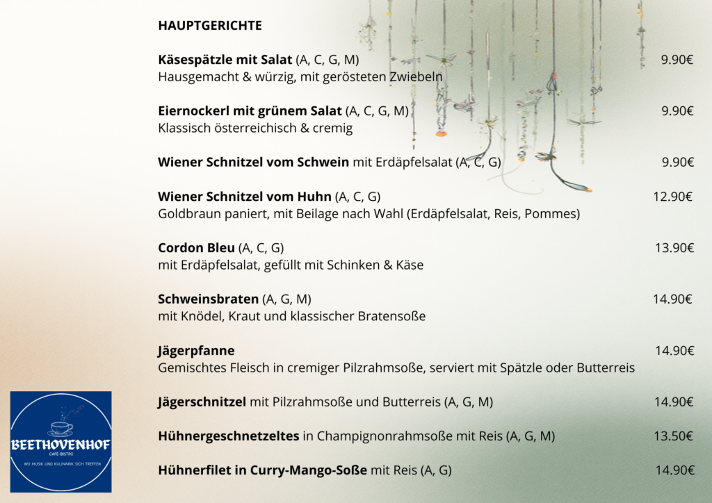 Elementor #7 Willkommen im Café Beethovenhof! Feine, liebevoll zubereitete hausgemachte Küche. Frühstück, Mittagessen, aromatischer Kaffee und köstliche Kuchen in einer warmen, gemütlichen Atmosphäre zum Verweilen.